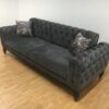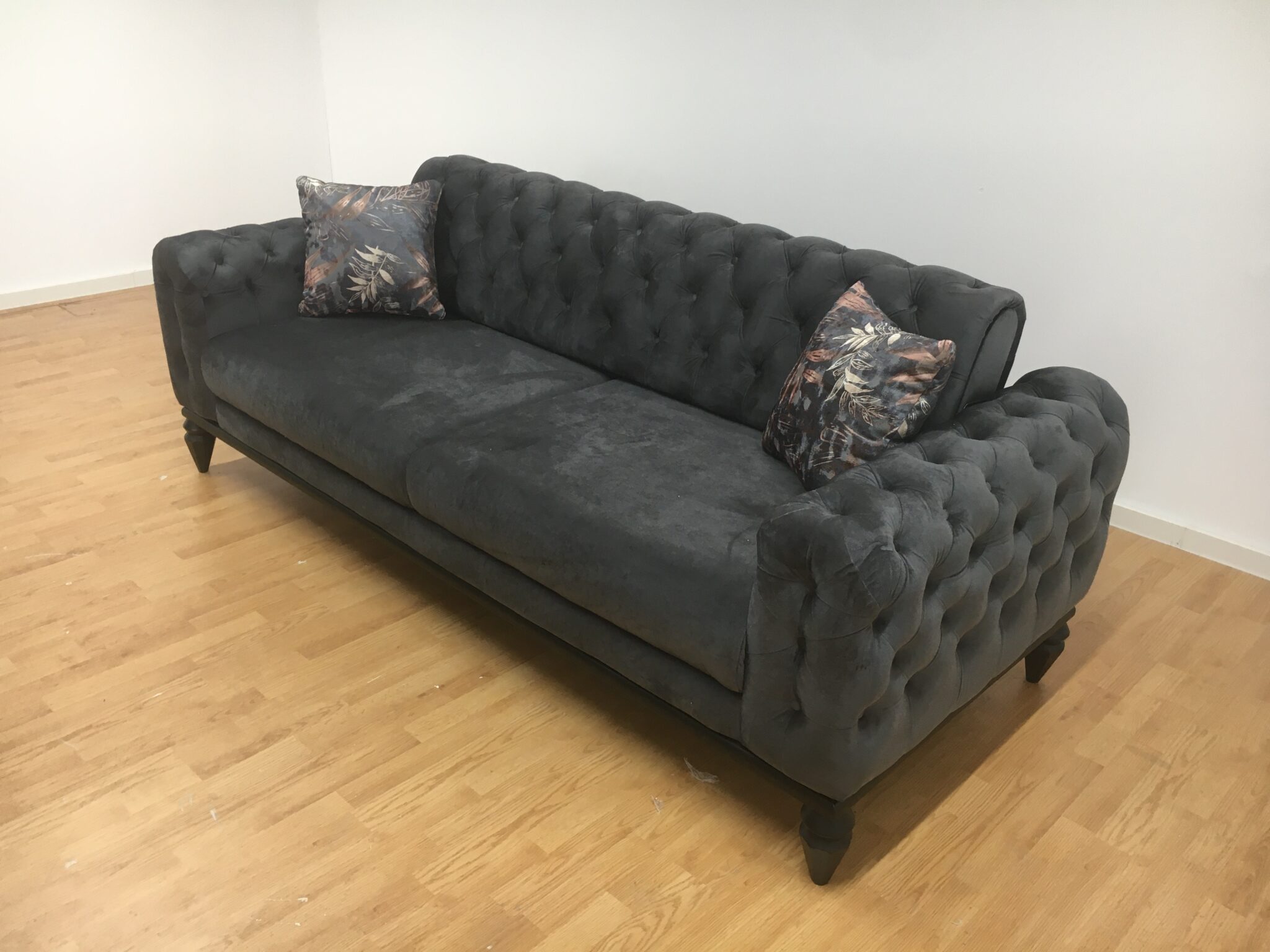Canapea 3 locuri, cu 2 perne incluse, realizată din structură lemn masiv, stofă catifelată, spătar si brațe tip Chesterfield, picioare lemn masiv elegante.