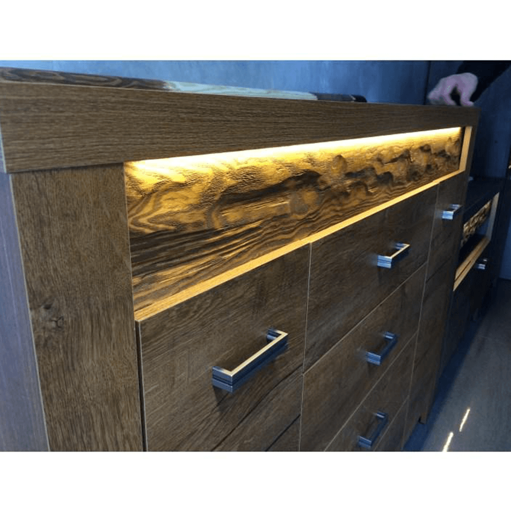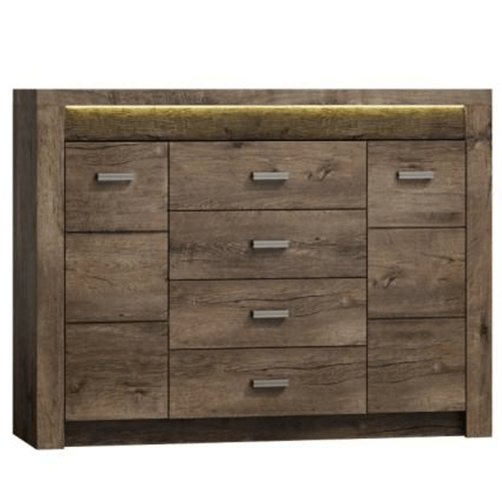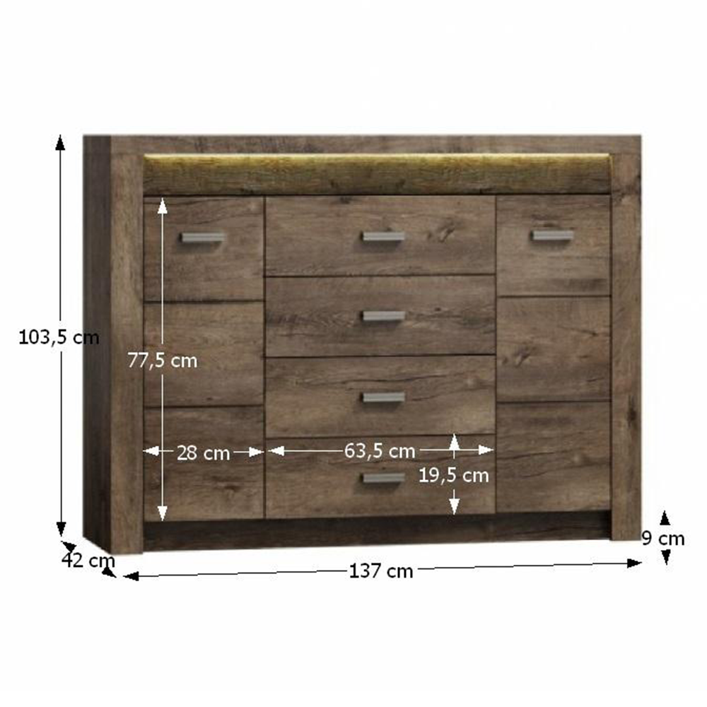În mijloc se află patru sertare. Placa iluminată este din lemn masiv.