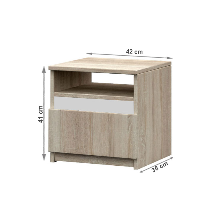 Noptiera MEDIOLAN 2 NEW are un design curat. În combinaţie cupatul MEDIOLAN 2 NEW formează o simbioză perfectă, care va deveni o decoraţiune funcţională al dormitorului dvs.. Noptiera dispune de un spaţiu deschisşiun sertar.