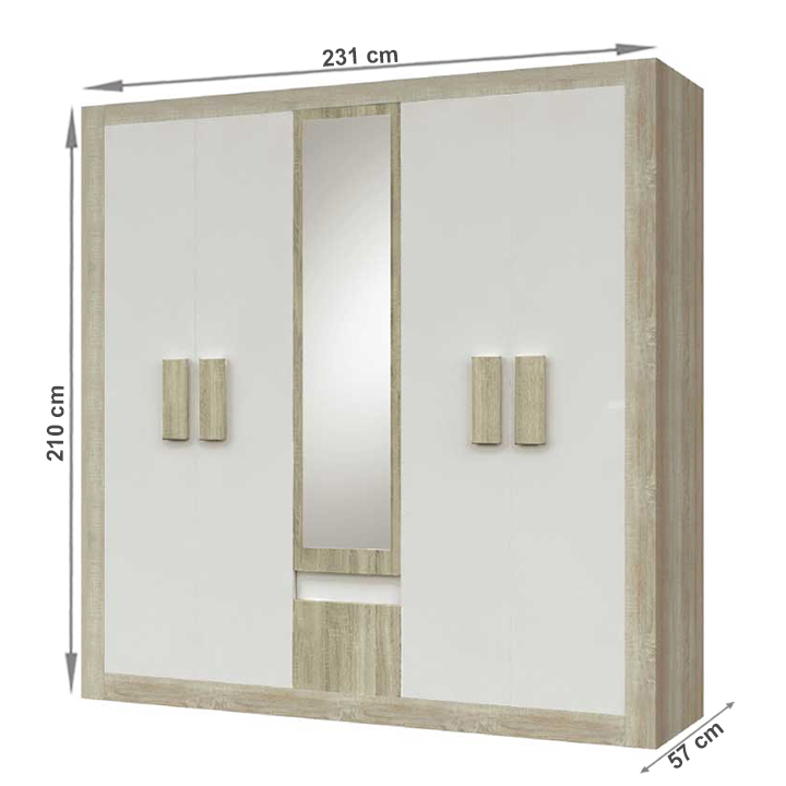 Dulapul cu 5 uşi MEDIOLAN 2 NEW se poate ocupa de colectarea tot mai mare de haine datorită spaţiului mare. clar şi organizat vă veţi pune hainele pe umeraşe, care veţi agâţa de două bare pt. haine, sau le veţi pune pe poliţe în mijlocul dulapului. Dulapul dispune de o oglindă mare, care vă va controla înainte de a pleca la lucru.