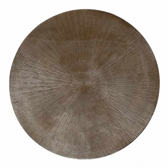 Setul Vittorio contine 3 masute de cafea cu dimensiuni diferite realizate din aluminiu. Blatul rotund auriu cu gravuri adauga tactilitate si stil pentru un aspect contemporan de lux.